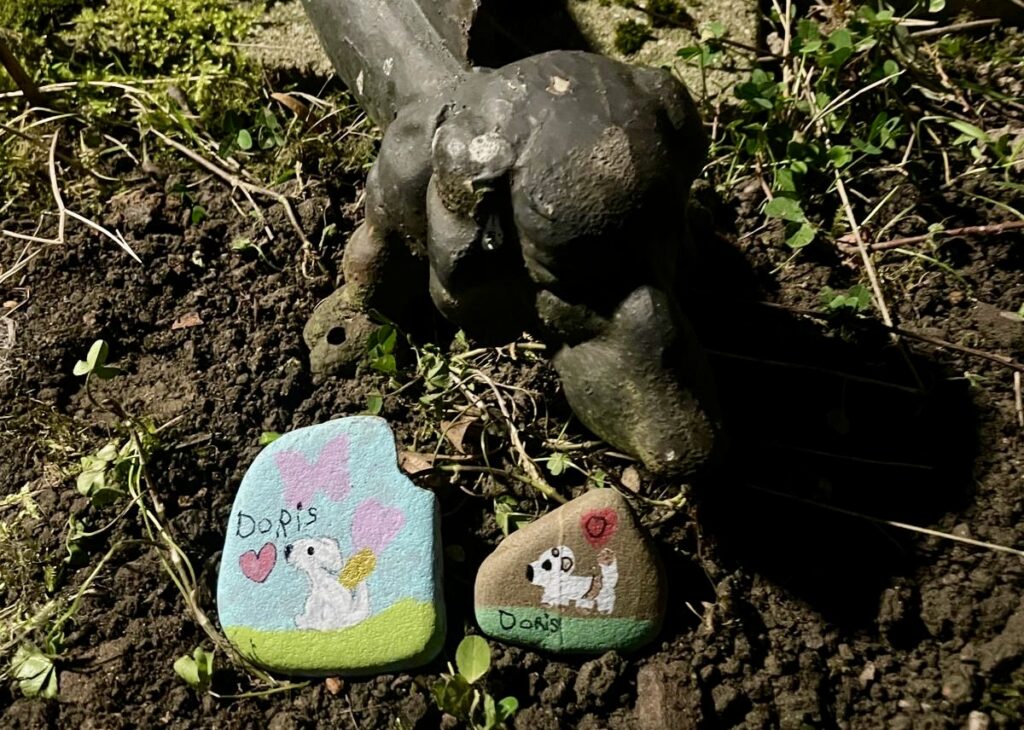 Wir haben uns so dolle über die wunderschönen Engelsteine gefreut, da sind bei mir vor lauter Rührung doch direkt wieder ein paar Tränchen gekullert. Die kleinen Kunstwerke haben wir zu Klein-Doris gelegt. Nun ist dieser Ort nicht mehr trüb und traurig, sondern fröhlich und bunt.