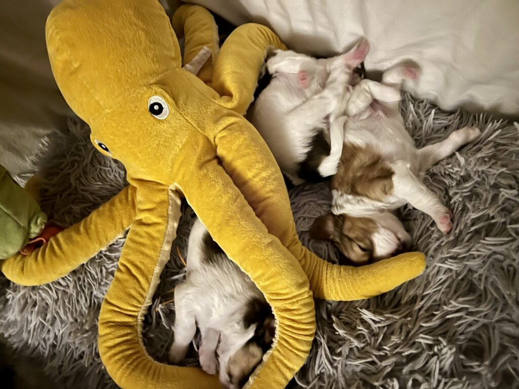 Direkt nach dem Umzug – Alle sind noch etwas durcheinander. Plötzlich wachen sie an einem komischen Ort auf. Alles riecht anders und hört sich anders an als vorher. Die Welpis sind noch vorsichtig und bleiben immer schön in der Nähe von ihrem vertrauten Kissen.