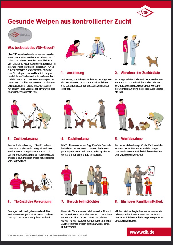 Bis Sie einen Welpen bei einem VDH-Züchter mit dem entsprechenden Qualitätssiegel erhalten, muss der Züchter mit seinem Hund verschiedene Prüfungs- und Kontrollebenen durchlaufen: