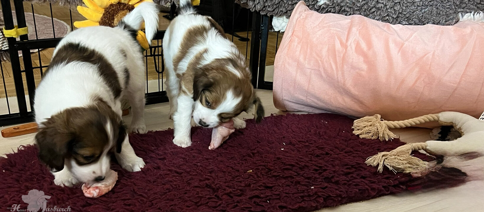 Es war der Tag der ersten Male. Es gab nämlich auch den ersten Hühnerflügel na ja, einen halben Flügel. Die Welpis stürzen sich drauf und der Mini-Wolf bricht sofort durch. Es hat ein bisschen gedauert, bis sie die richtige Technik drauf hatten, aber geschafft haben es alle … und geschmeckt hat es auch allen!