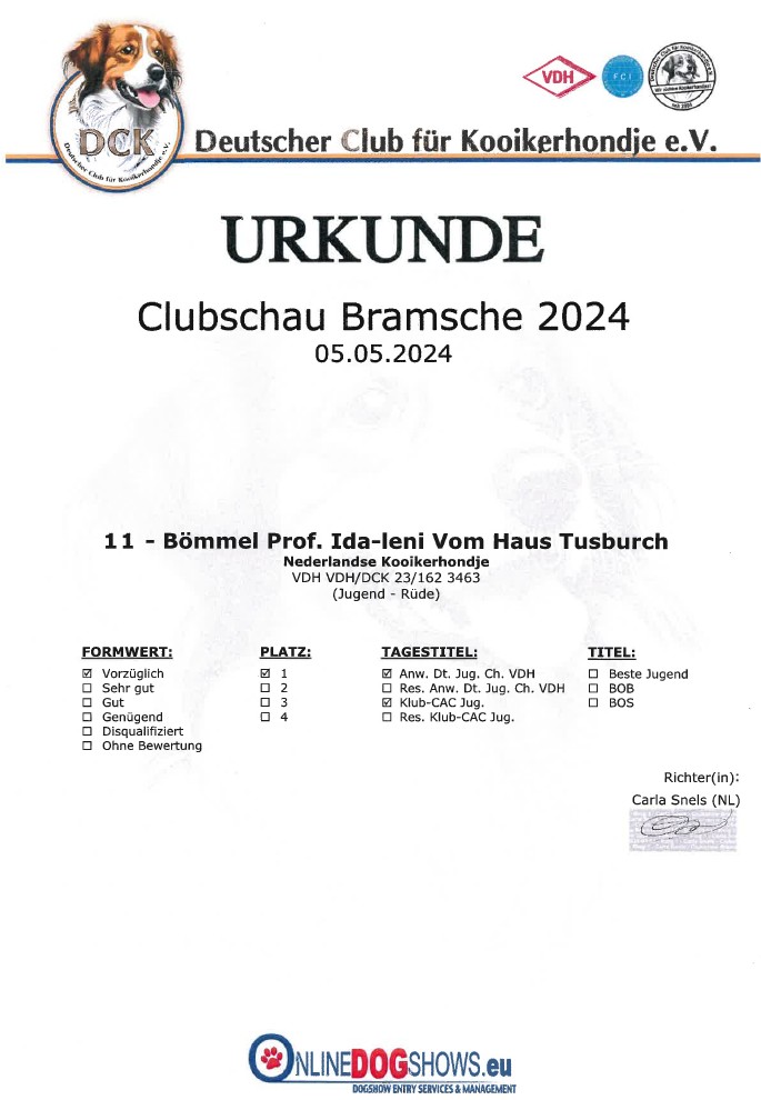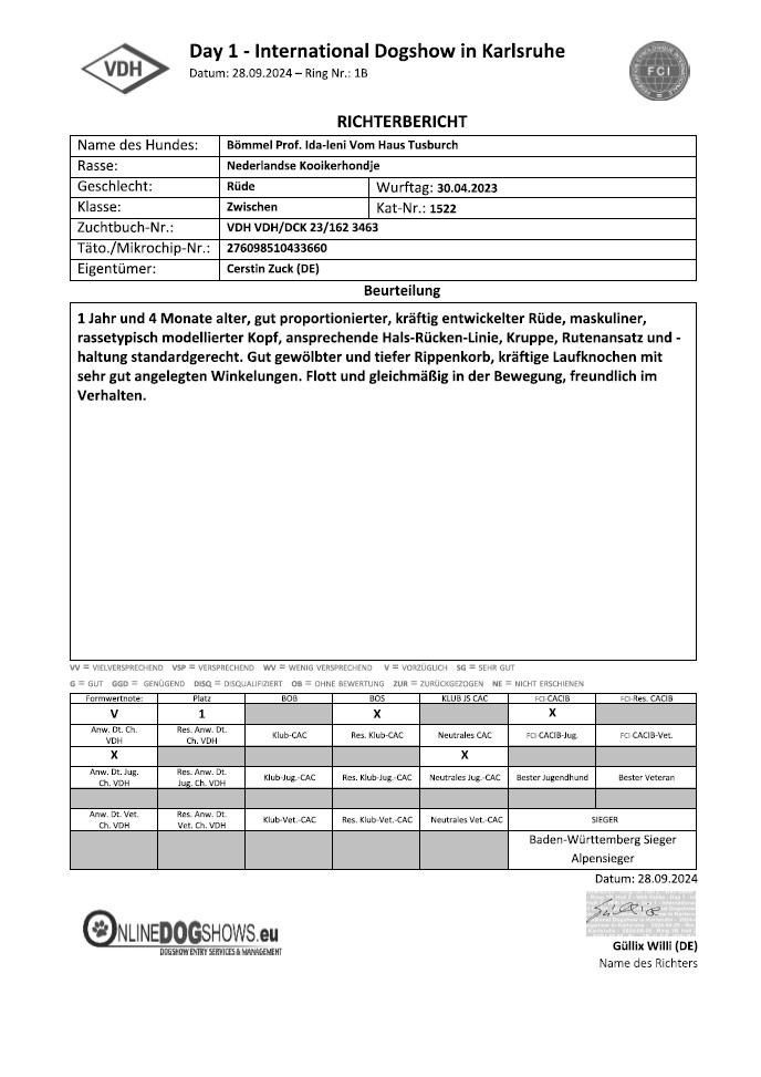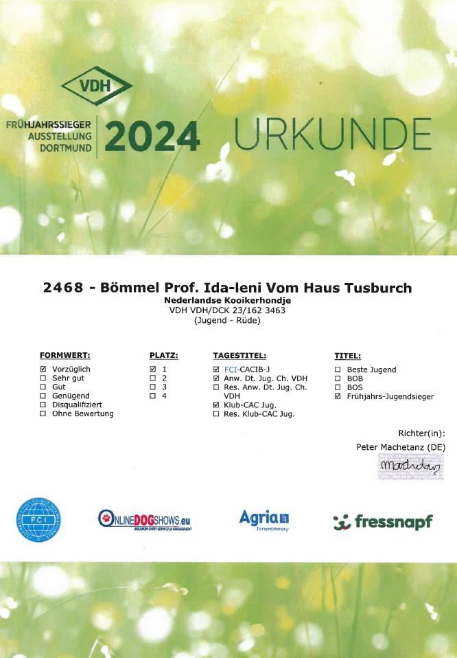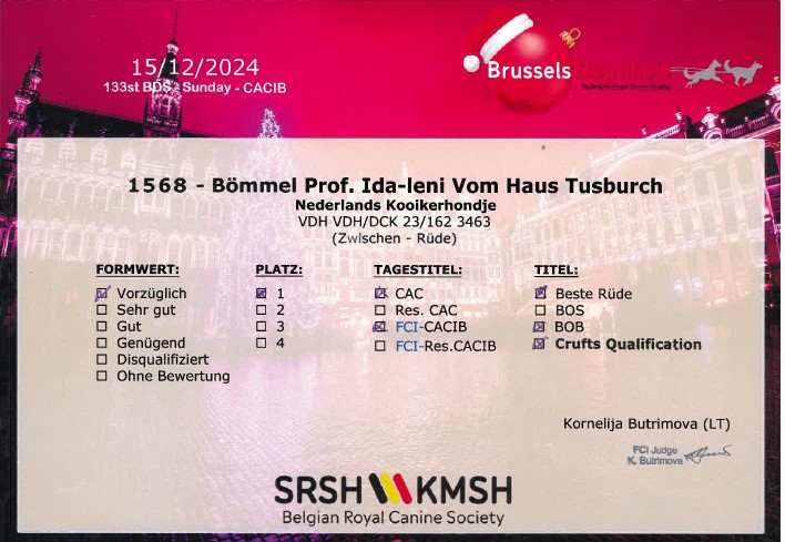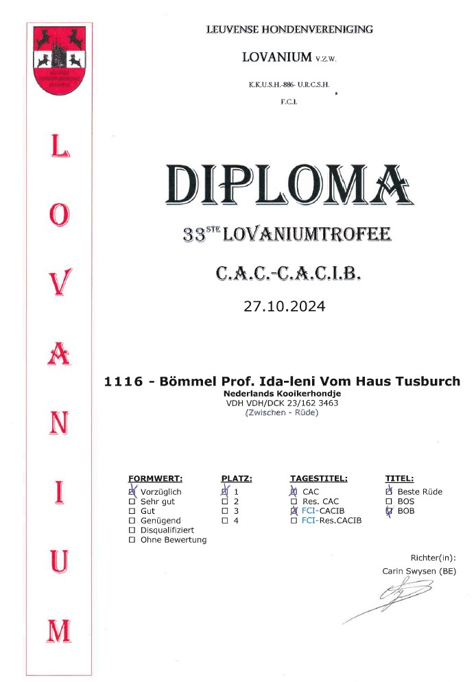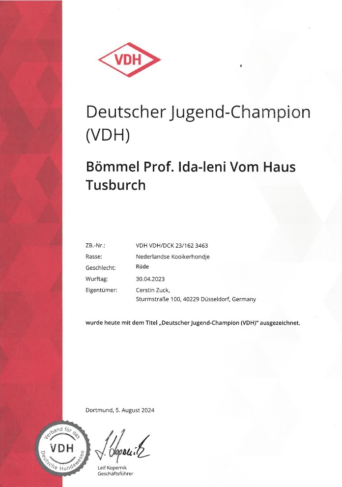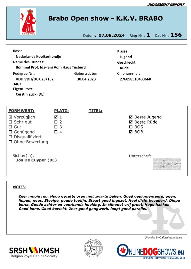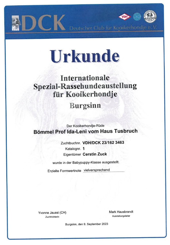Stand 10/2025: Bömmel ist sehr erfolgreich bei Ausstellungen. Er ist mittlerweile DCK-Jugendchampion, Belgischer Champion und Luxemburger Champion. Ich bin sehr stolz, dass ein Hund aus meiner Zucht so erfolgreich ist!