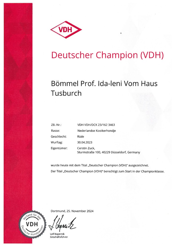 Update von Cerstin, Bömmels Frauchen, März 2025: „Bömmel hat bisher den Deutschen Jugend Champion VDH und den Deutschen Champion VDH. Gerade sind wir dabei, den Internationalen Champion zu machen. Aber dafür brauchen wir noch eine Anwartschaft aus einem anderen Land. Im Juni fahren wir in die Schweiz. Mal schauen wie es da läuft.“