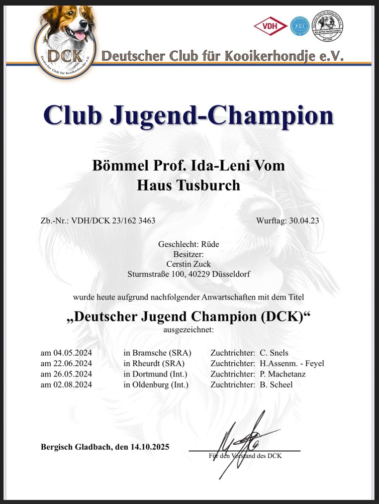 Stand 10/2025: Bömmel ist sehr erfolgreich bei Ausstellungen. Er ist mittlerweile DCK-Jugendchampion, Belgischer Champion und Luxemburger Champion. Ich bin sehr stolz, dass ein Hund aus meiner Zucht so erfolgreich ist!